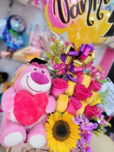 Puedes agregar Globos Metalizados, Globos Burbuja, Ferrero, Peluches, Llaveros a los bouquets dependiendo de tu presupuesto (en algunas fotos se encuentran ejemplos de como quedaria el bouquet) o simplemente otro girasol