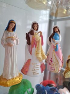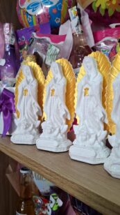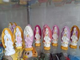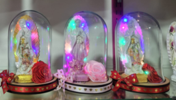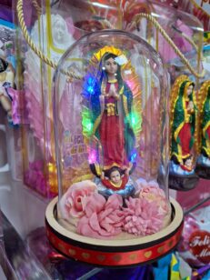 - Virgen full color de 18cm aprox. En urna de vidrio con luz led y flores artificiales