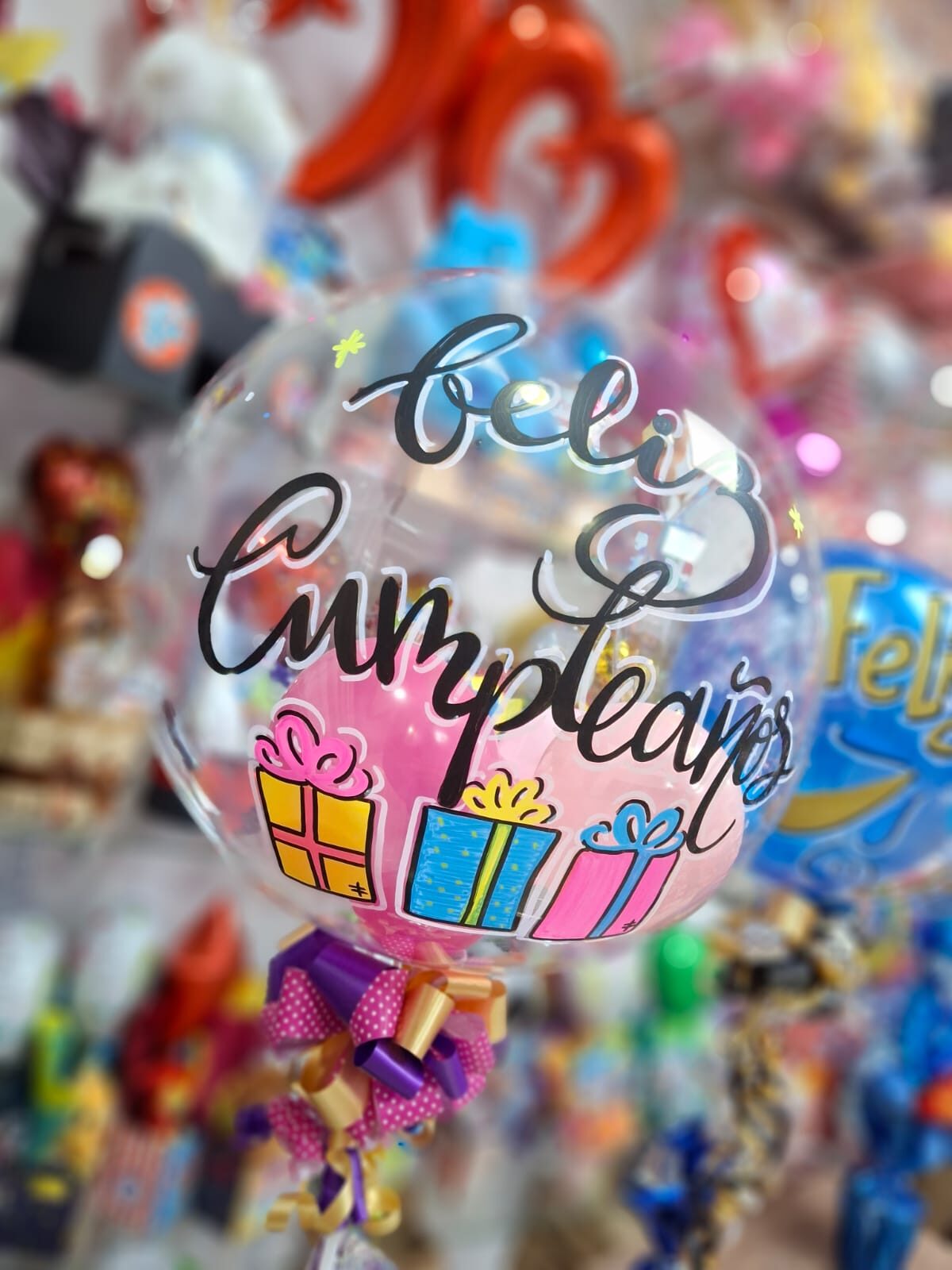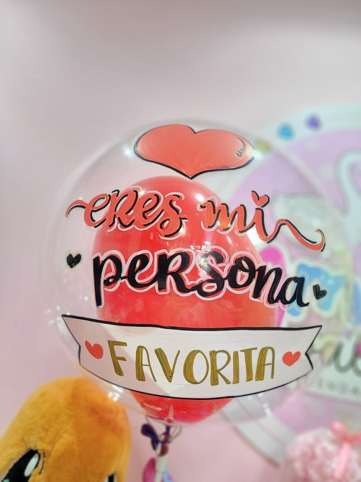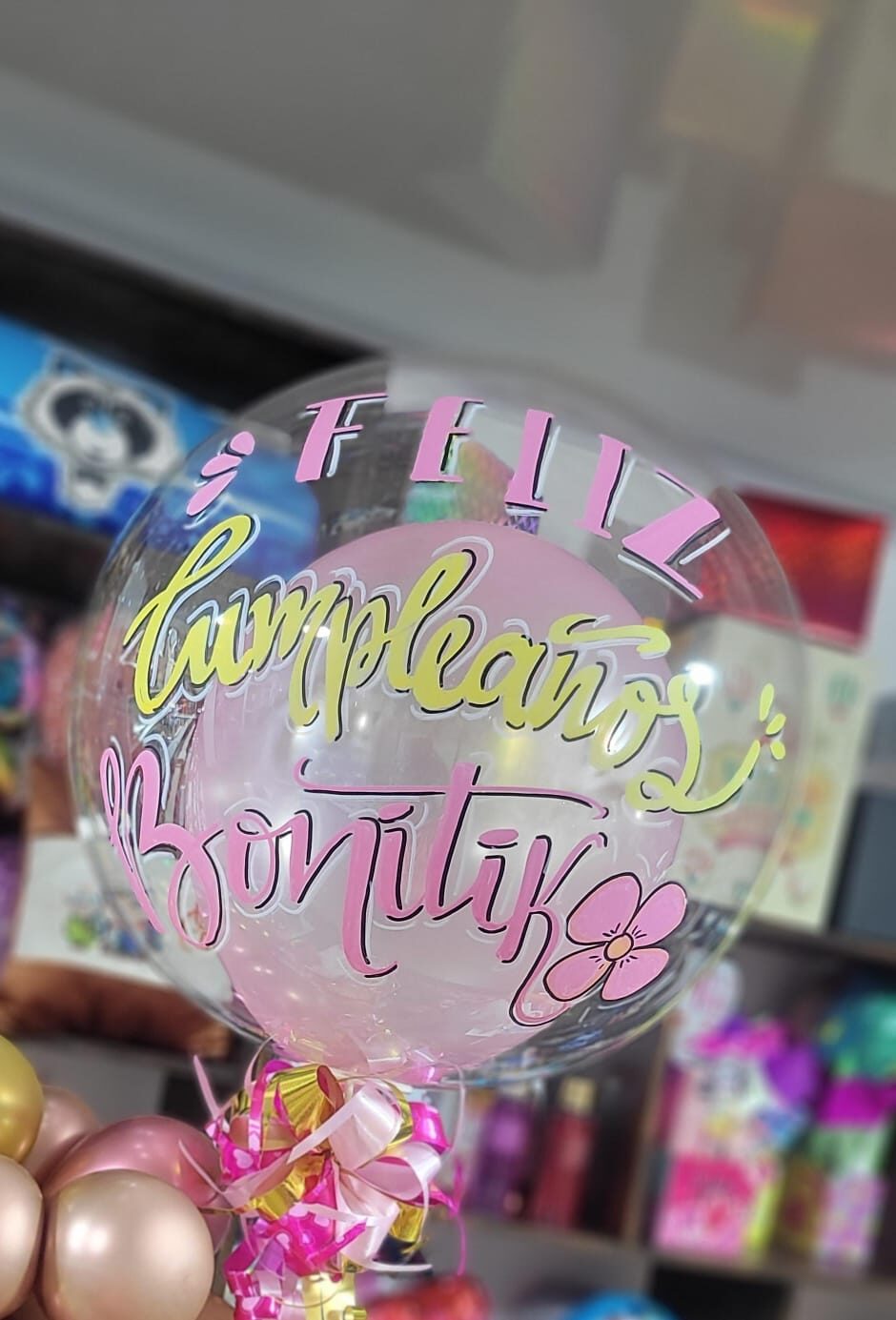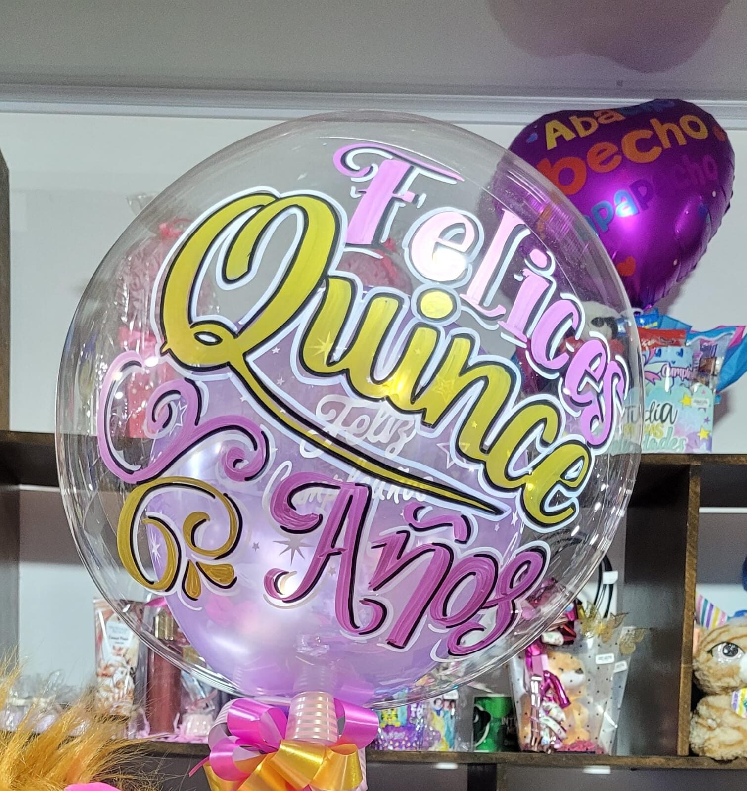 Globo Burbuja sencillo con solo texto. Inlcuye globos r6 por dentro o 1 globo r12 segun ocasion y Moño