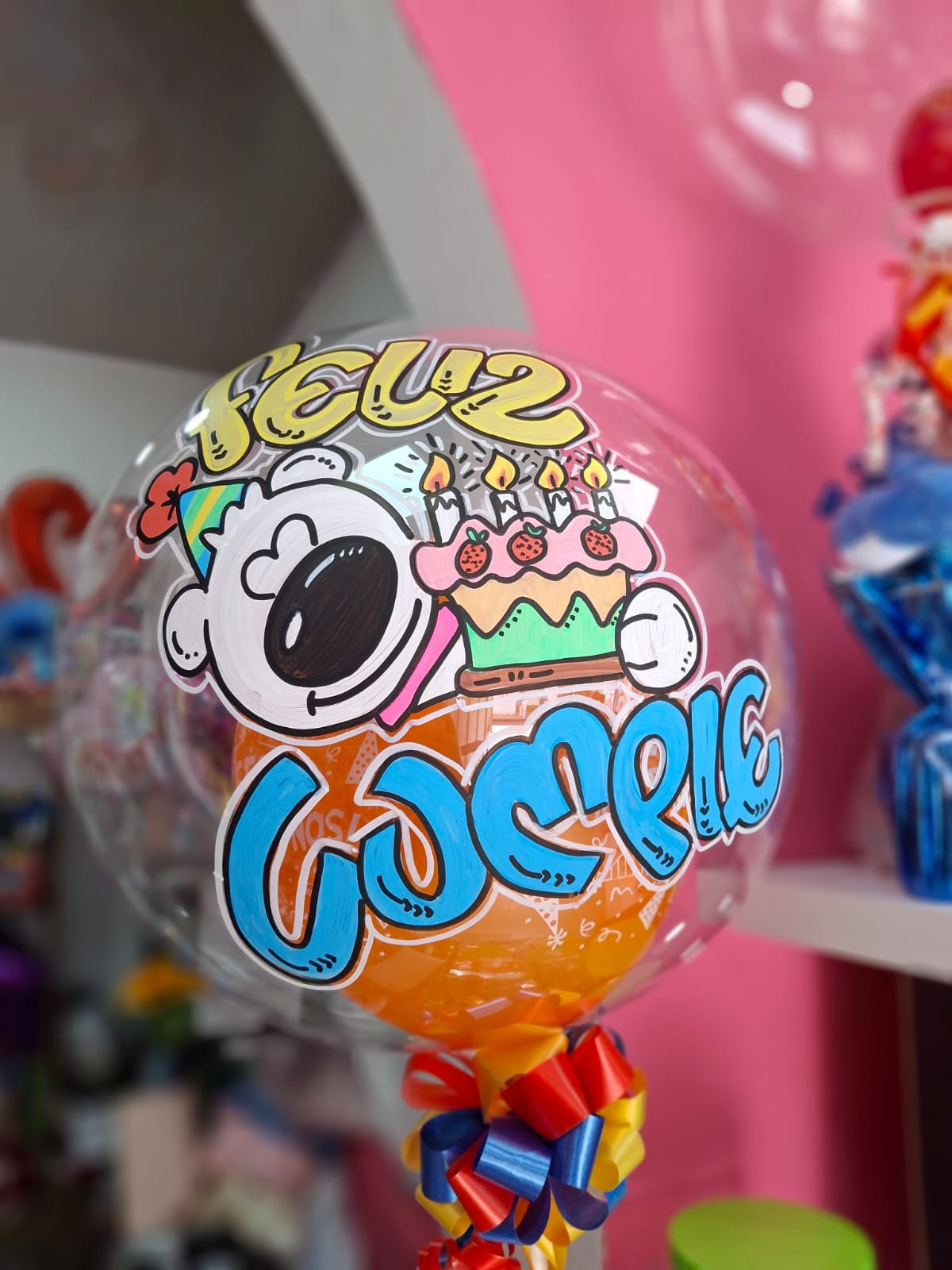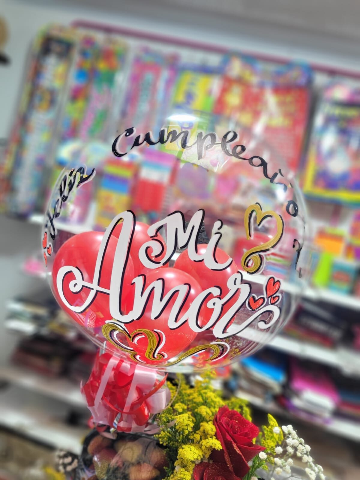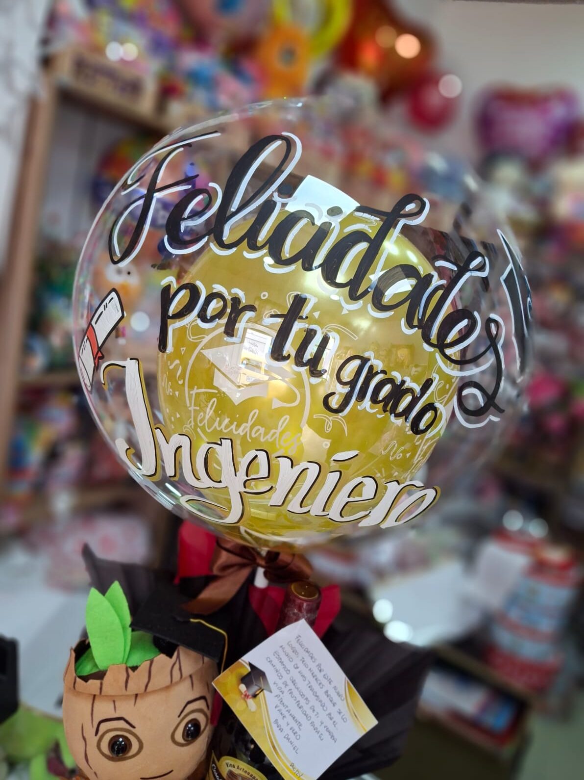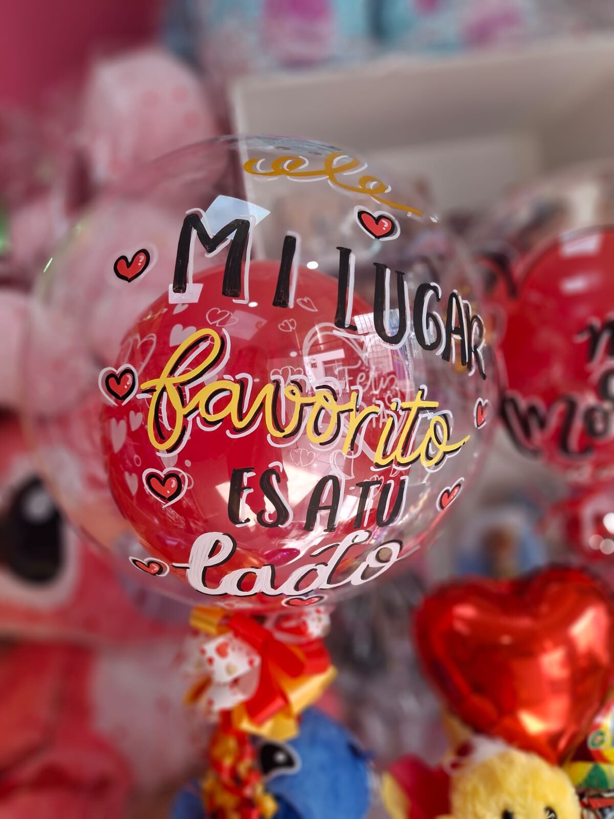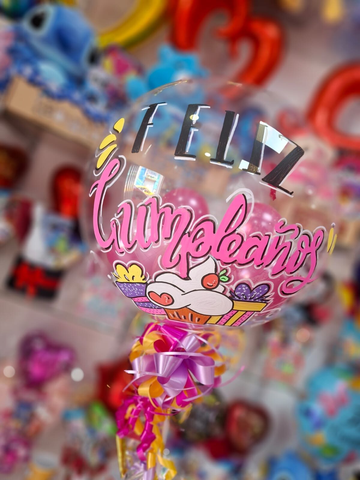 Globo Burbuja sencillo con solo texto. Inlcuye globos r6 por dentro o 1 globo r12 segun ocasion y Moño